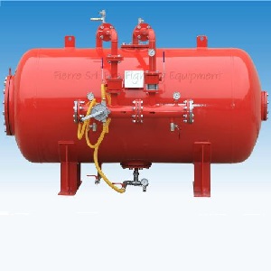 Bladder tank is most common foam generation package. It consists of a pressure vessel which is containing a rubber bladder made of Neoprene or hypalon rubber. Foam charged inside the bladder and forcefully exits by water pressure around the bladder when needed. Then concentrated foam pass through a calibrated orifice and inject into the water by foam proportioner preinstalled on bladder vessel.