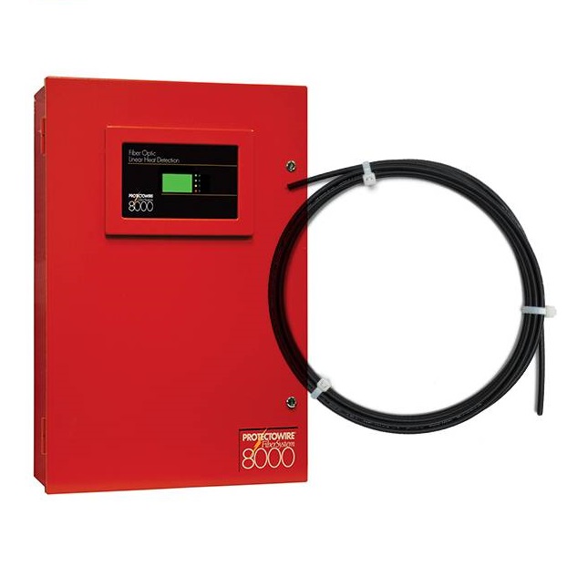 This product is best described as a continuous linear thermometer actively reporting temperature readings in realtime. The restorable linear heat detector is comprised of quartz fibers enclosed in a low smoke zero halogen jacket. Immune to all EMI and RFI, the fiber optic linear detector can be configured to offer custom alarm criteria and zone sizes up to 30,000 feet (10 + km) in length.